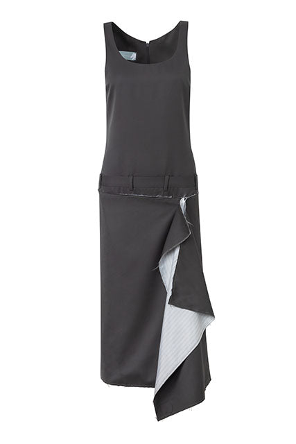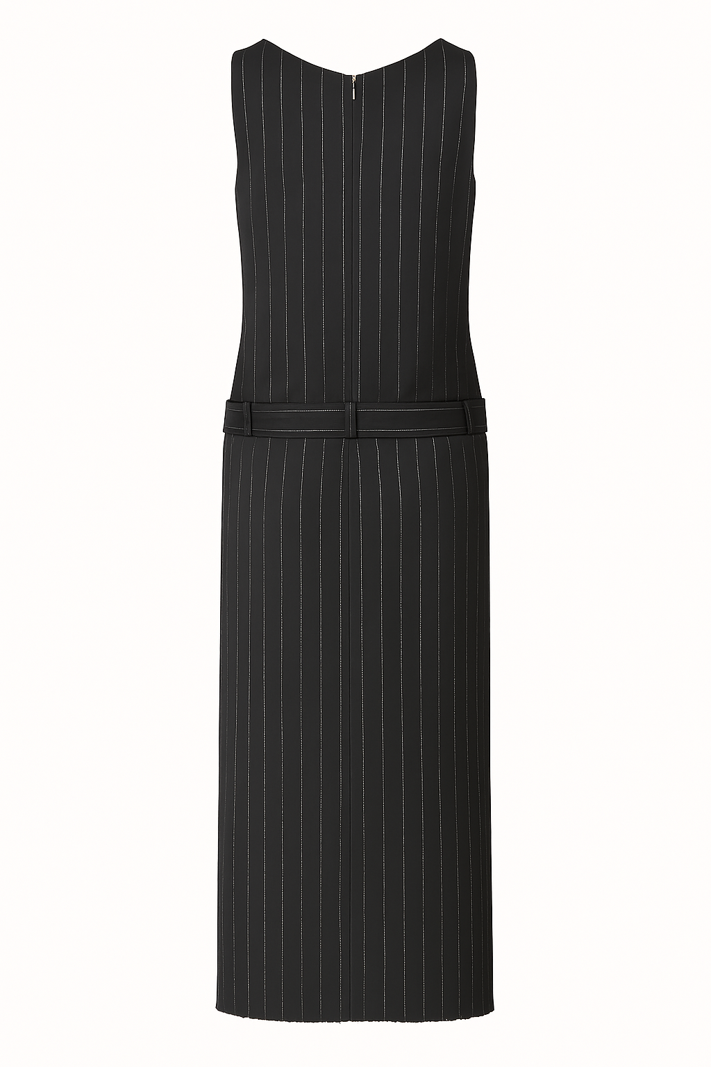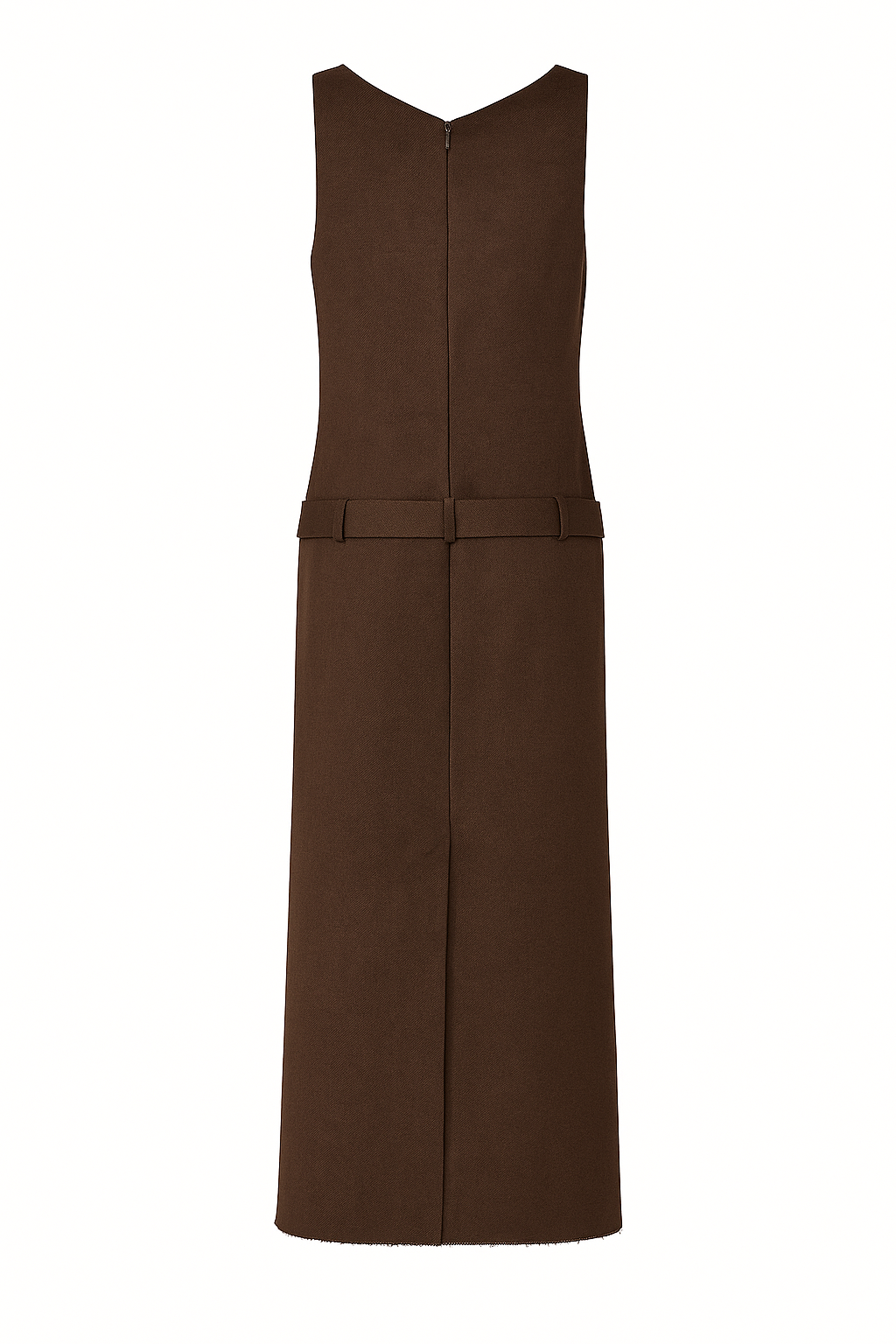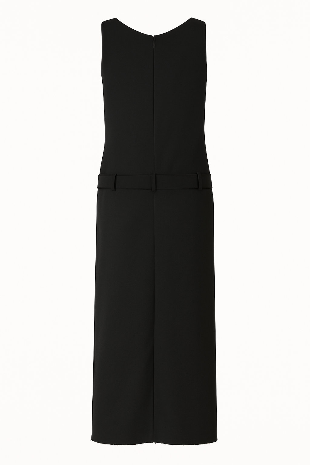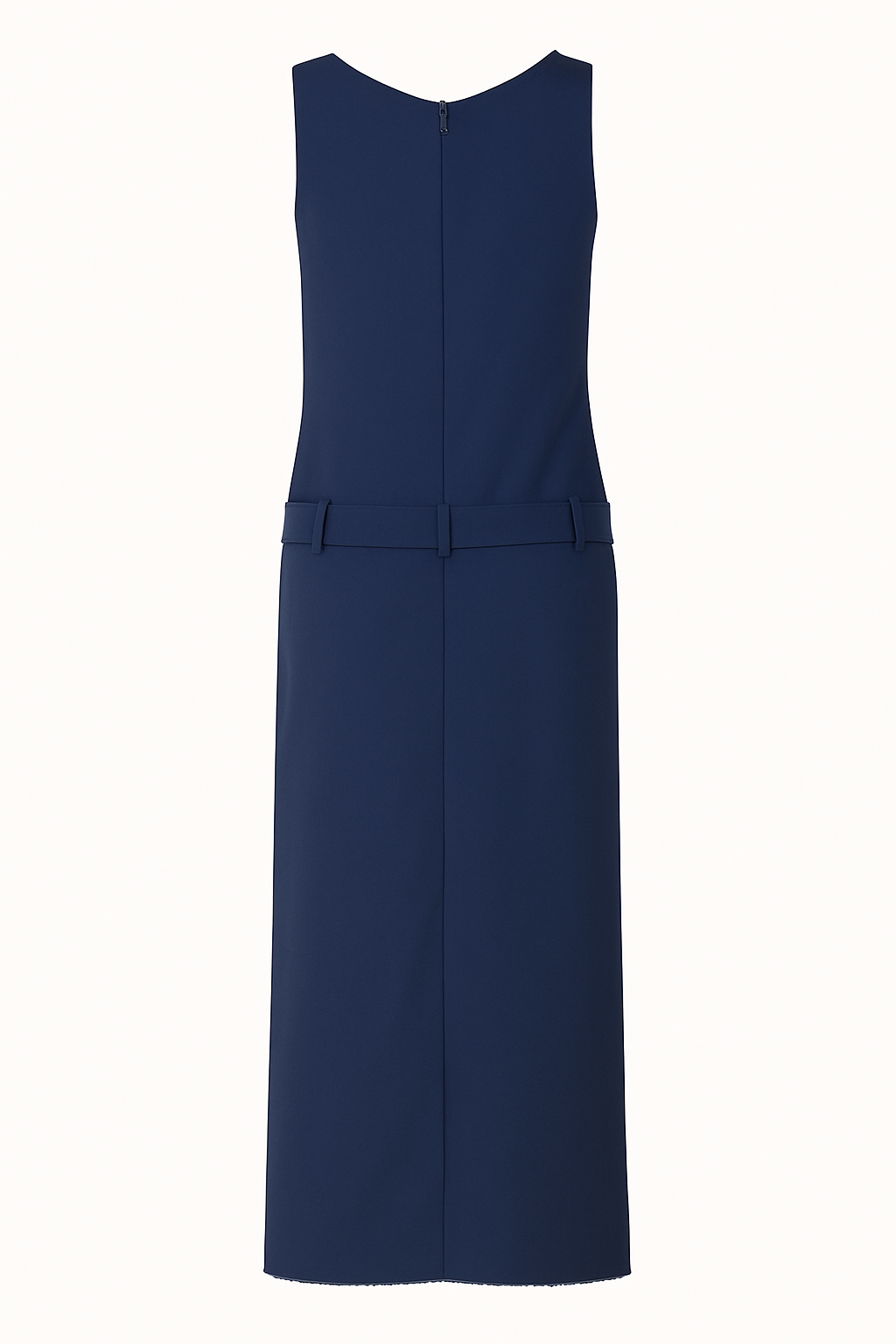 Vestido sartorial, manga sisa, escote redondo amplio en delantero y espalda, falda silueta recta, largo midi con sobre falda puesta y abotonadura, corte a la altura de la primera base simulando pretina con pasadores funcionales.